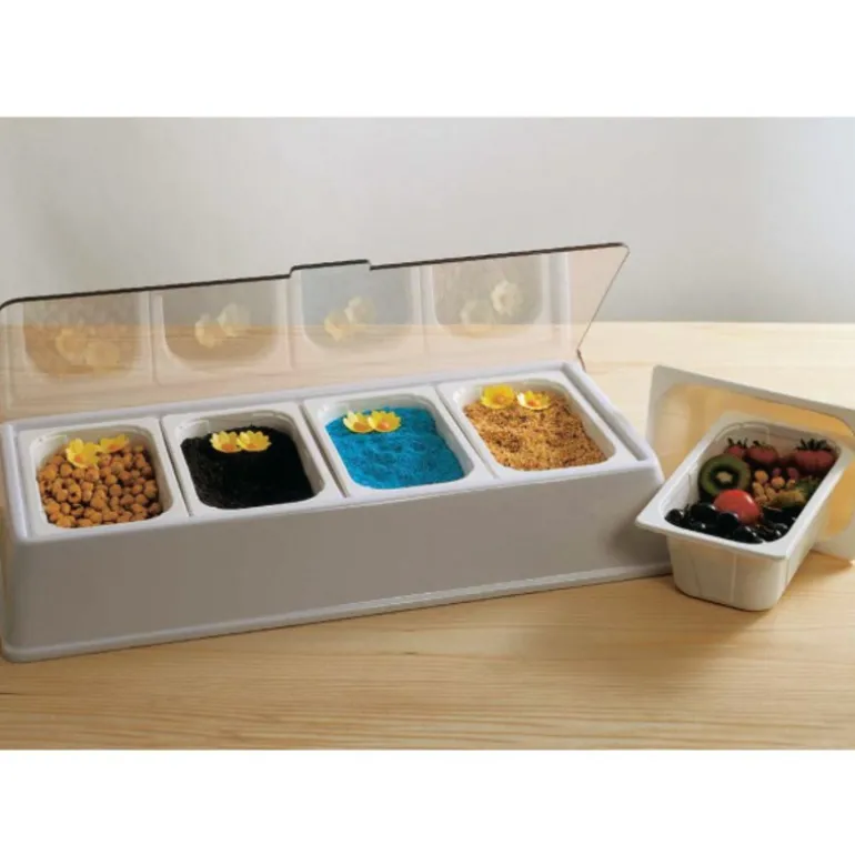 Bac De Stockage En Plastique Durable Convenant Pour Le Stockage Et La Conservation Des Cereales, De La Farine, Des Fruits, De La Nourriture Et Des Condiments.Il Est Etudie Et Concu Pour Une Utilisation Professionnelle En Cuisine, Pizzeria, Boulangerie Et Patisserie.L’Interieur Est Divise En 4 Bacs, Chacun D’Une Capacite De 2 Litres.