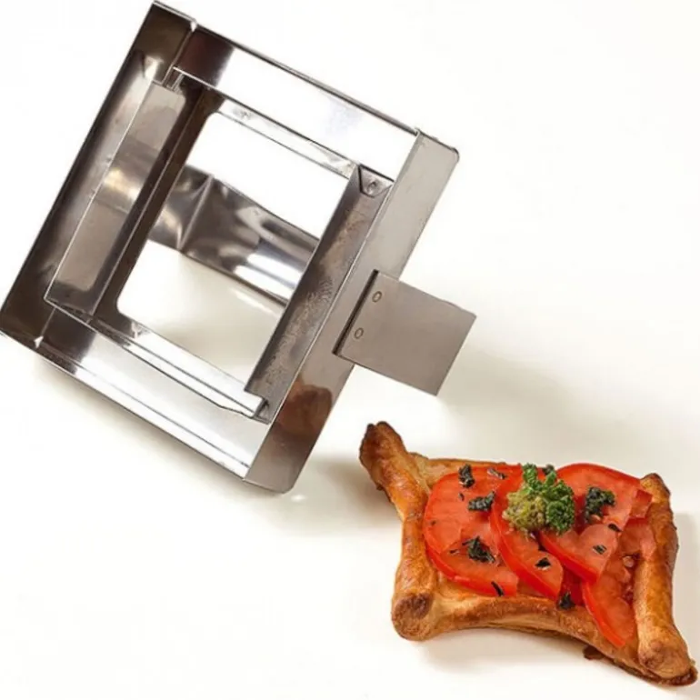 Decoupoir Carre Double Avec Poignée Decoupoir Carre Double En Acier Inoxydable Equipe D’Un Tranchant Biseaute, Pour La Confection De Bouchees Carrees Dites « Fuits De Mer ». Le Polyglass Est Un Materia