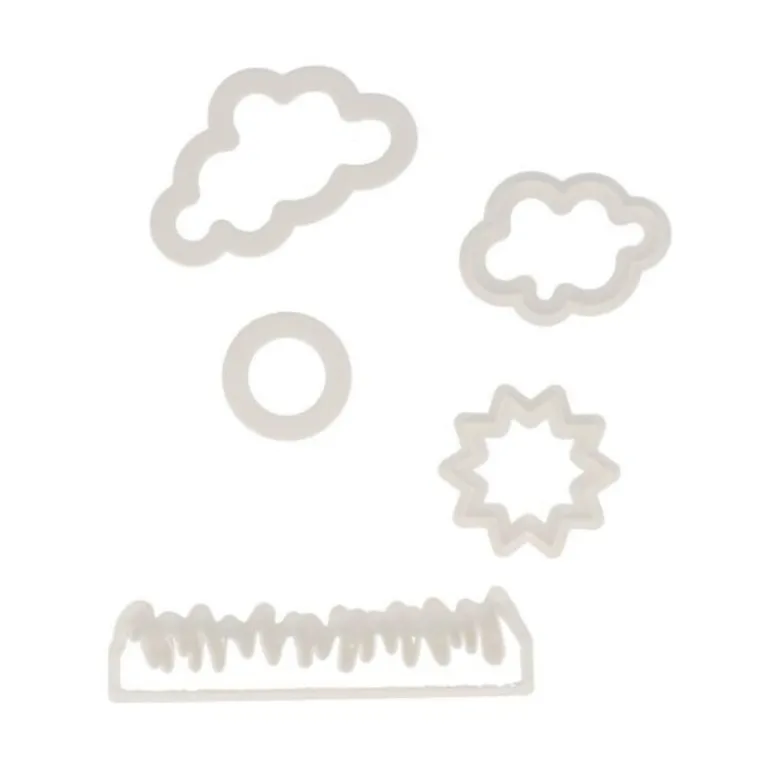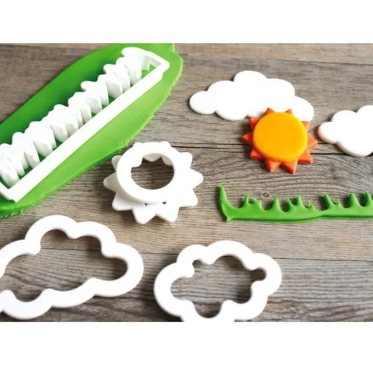 Jeu De 5 Découpoirs « Nature » (Nuages, Soleil, Herbe) Special Pâte À Sucre Et Pate D’Amande. Ils Seront Egalement Parfaits Pour Realiser Des Biscuits Et Petits Gâteaux.