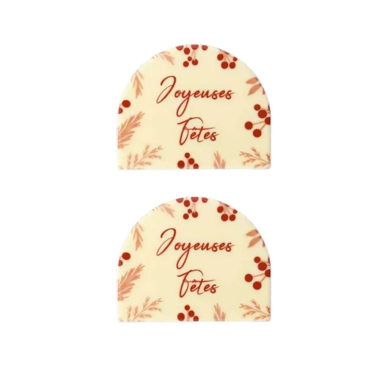 Ces Embouts De Bûches En Chocolat Blanc Decor « Joyeuses Fêtes » Sont Des Décors Pâtissiers Comestibles Elegants. Ils Apporteront La Touche Finale A Vos Décorations De Bûches Et Gâteaux De Noël.Prets A L’Emploi, Ils Sont Faciles A Utiliser : Il Suffit De Les Placer A Chaque Extremites De Vos Bûches.Leur Format De 54 Pièces Est Ideal Pour Les Professionnels Cherchant A Decorer Leurs Creations En Grande Quantite.Dimensions : 80 X 65 Mm