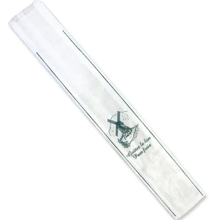 Sac A Baguette Kraft Blanchi (X1000) Sacs A Baguette En Papier Kraft Blanchi Avec Soufflets, Impression Verte « Goutez Le Bon Pain Frais », Vendus Par Lot De 1000 Pièces De Taille Identique. Le Sac A Baguette Kraft Blanchi Mesu