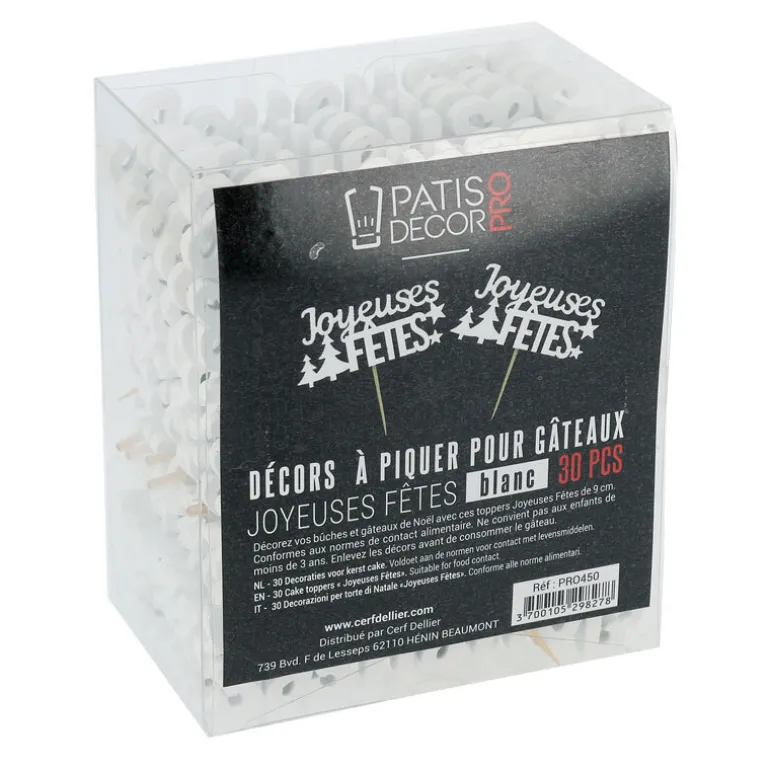 Commandez Des Maintenant Ces Décors Sur Pique « Joyeuses Fêtes » Blancs Pour Ajouter Une Touche Festive A Votre Table De Fete Et Impressionner Vos Invites.Il Decoreront A La Perfection Vos Gâteaux, Cupcakes, Entremets Et Autres Creations Culinaires.Conditionnes Par 30.Dimensions : 9 Cm Hors Pique